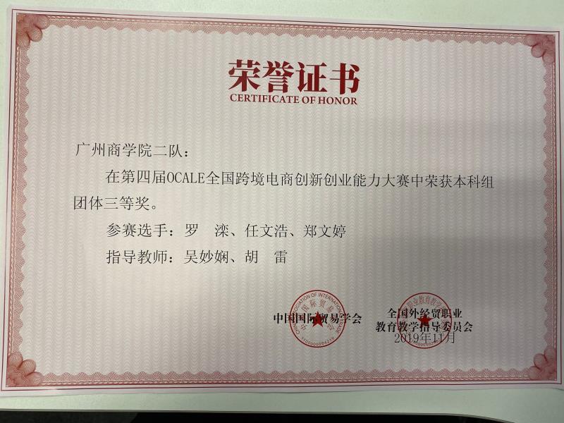 11月18-19日,第四届OCALE全国跨境电商创新创业能力大赛落下帷幕。17电商及物流专业的黄楚清、许玉媚和郭宝婷组成的“广州商学院一队”,17电商及国贸专业的罗滦、郑文婷和任文浩组成的“广州商学院二队”两支队伍参加全国赛。在9428cn太阳集团古天乐教师胡雷及吴妙娴的指导和带领下,团队认真组织、策划、进行数据处理与分析,综合运用跨境电子商务运营等知识技能,最终都荣获本科组三等奖。