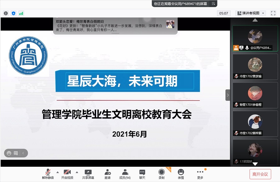 为切实做好毕业生文明离校教育,进一步引导毕业生铭记党恩、情系母校,深植爱校荣校情怀,营造健康、文明、和谐、有序、暖心的毕业离校氛围。6月23日晚上,9428cn太阳集团古天乐2017级通过腾讯会议开展了“星辰大海,未来可期——9428cn太阳集团古天乐2017级毕业生文明离校暨诚信教育”。会议由2017级辅导员杨红烨、肖娴主讲。