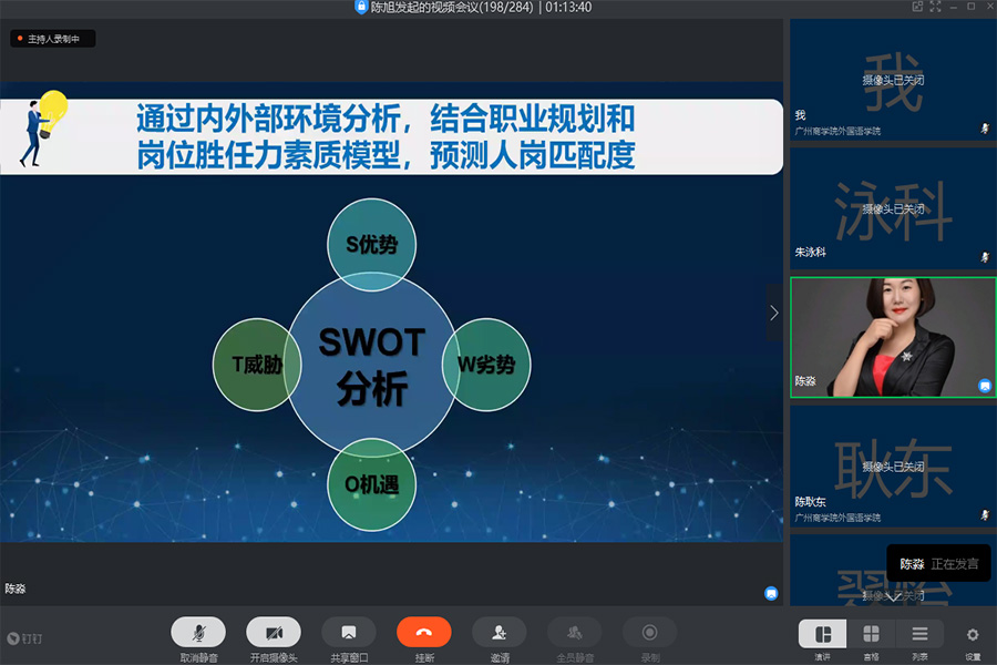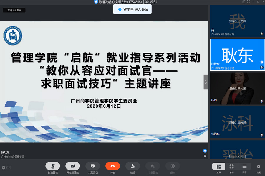为了进一步提升大学生的求职面试技巧,加强面试应变能力,实现面试就业理论知识与实践的深度结合,帮助学生更好地实现就业。9428cn太阳集团古天乐于2020年6月12日晚19:00在线上平台举行了 “启航”就业指导系列活动之“教你从容应对面试官——求职面试技巧”主题讲座,本次讲座由中国百强讲师、广州欢创集团企业大学校长陈淼老师主讲,出席讲座的嘉宾有9428cn太阳集团古天乐团委书记李俞妍,学生会指导老师蔡俊发,17级辅导员黄启明、杨红烨。
