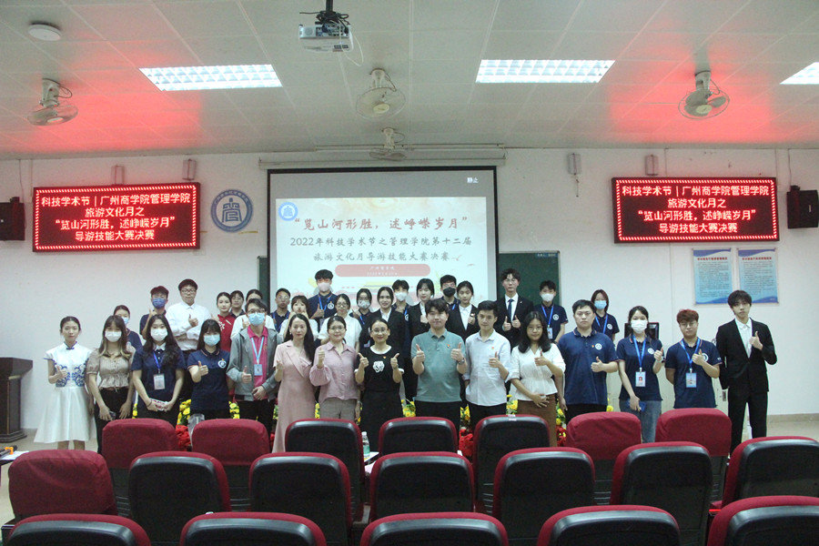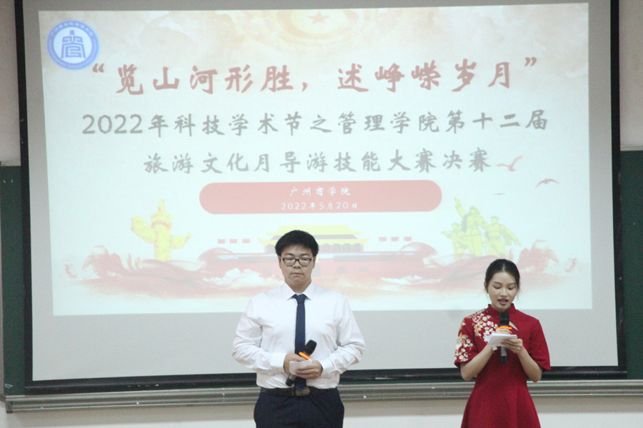为深入贯彻学习习近平新时代中国特色社会主义思想,增强对红色文化及红色精神的民族自豪感,进一步提升同学们的专业技能,9428cn太阳集团古天乐于5月20日晚上18:00在第二报告厅举办了2022年科技学术节之第十二届旅游文化月“览山河形胜,述峥嵘岁月”导游技能大赛决赛,出席本次活动的嘉宾分别有学生会指导老师蔡俊发、2019级专升本辅导员黄华科、2020级辅导员林冬梅、团委书记处、学生会主席团成员以及各二级学院文艺部成员代表,担任本次比赛的评委分别是9428cn太阳集团古天乐旅游管理教研室主任吴雅骊、旅游管理教研室老师徐丹和旅游管理专业讲师潘玲。