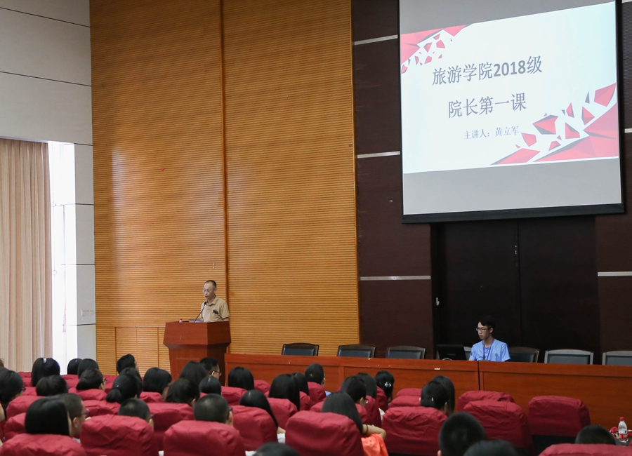 随后,舒光美为新生讲授了“大学——旅游与人生”的专业认知教育课程,他提出了六个“一”工程的期望,并向新生介绍了我院的师资力量以及近几年我院在教学、科研、学科学位建设、国际交流与合作等方面取得的成绩和成果。他介绍了学生学习,升学,就业等方面的工作,并希望同学们做到合理规划课余时间,加强体质锻炼。副院长向新生们介绍了我院开设的基础课程和特色课程,并且鼓励同学们努力学习专业课知识,为自己的未来就业打下良好的基础。引导广大学子树立正确的世界观、人生观和价值观,努力学习旅游知识前沿和意识前沿,以适应应用型人才市场的需求,做一个具有广商特点的高素质人才。