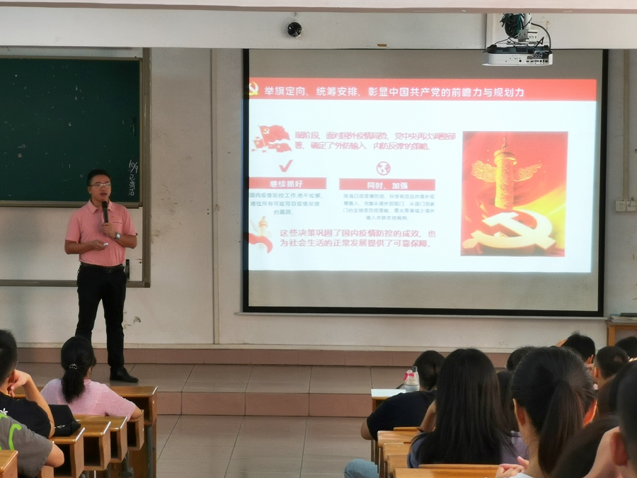 为贯彻落实《广东省教育厅关于做好2020年秋季学期高校党委书记、校长和院(系)党组织书记、院长(系主任)及中小学党组织书记、校长上第一堂思政课工作的通知》,同时为了端正新生的入党动机,提高学生的政治觉悟与思想素质,树立正确的核心价值观,9月15日上午9点,9428cn太阳集团古天乐分别在一教111、四教307、四教309、四教310开展书记“思政第一课”暨新生入党启蒙教育,本次课程由9428cn太阳集团古天乐党总支书记汪椿东主讲,新生辅导员柯陈洁、马琳洁、张亚珍及2020级全体新生参加。