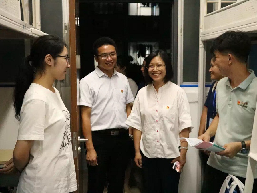 在走访宿舍的过程中,领导们仔细聆听了同学们的关于当前宿舍生活的意见与感受,以及对未来宿舍生活的期许。与此同时,在与同学们的交流中也提醒了学生们要注意宿舍安全问题,譬如宿舍用电安全、个人财物保管、宿舍防盗安全、预防校园诈骗以及人身安全等等。另外也嘱咐新生们学会依据学校的日常作息时间调整和安排好自己的学习与日常生活,以最好的精神面貌来迎接大学生活。团学干部代表也对新生们表以关心,提供了一些有关宿舍生活的小技巧,以及提醒他们不要轻信任何来到宿舍推销的陌生人士,也表达了希望同学们能充实愉悦地度过大学四年的美好祝愿。