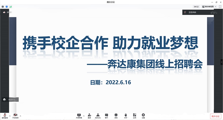 奔达康集团HR首先就企业概况、企业业务、企业文化、人员需求、员工晋升机制等多方面内容进行介绍。其次,结合当前社会严峻复杂的疫情防控形势和就业环境,分析了毕业生的就业形势,表示将通过多种形式开展合作,与我校共同推进2022届、2023届学生就业工作。最后,表示我校是值得信赖的学校单位,奔达康集团也会给学生们提供稳健发展的薪酬和全面的福利保障,非常希望能够引进我系学子,为企业的发展注入活力。